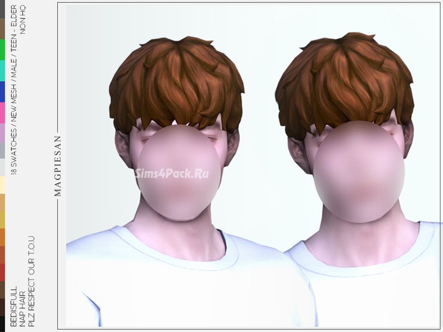 Короткая стрижка на густых, хаотично уложенных Maxis Match волосах, в 18 EA цветовых образцах. Прическа частично работает с головными уборами. Доступна для мужчин.