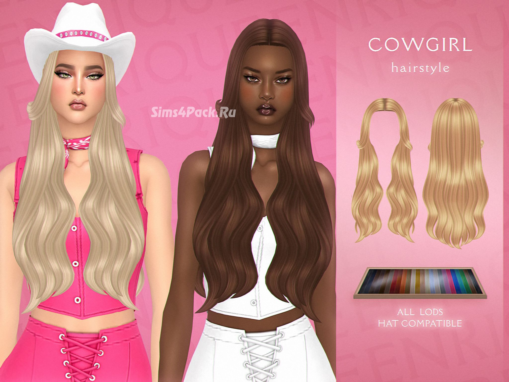 На создание этой причёски автора вдохновил образ Марго Робби в фильме Барби. Длинные волосы в стиле Maxis, уложенные на прямой пробор, в 24 EA свотчах. Причёска частично совместима с головными уборами. Maxis Match. Доступно для женщин.