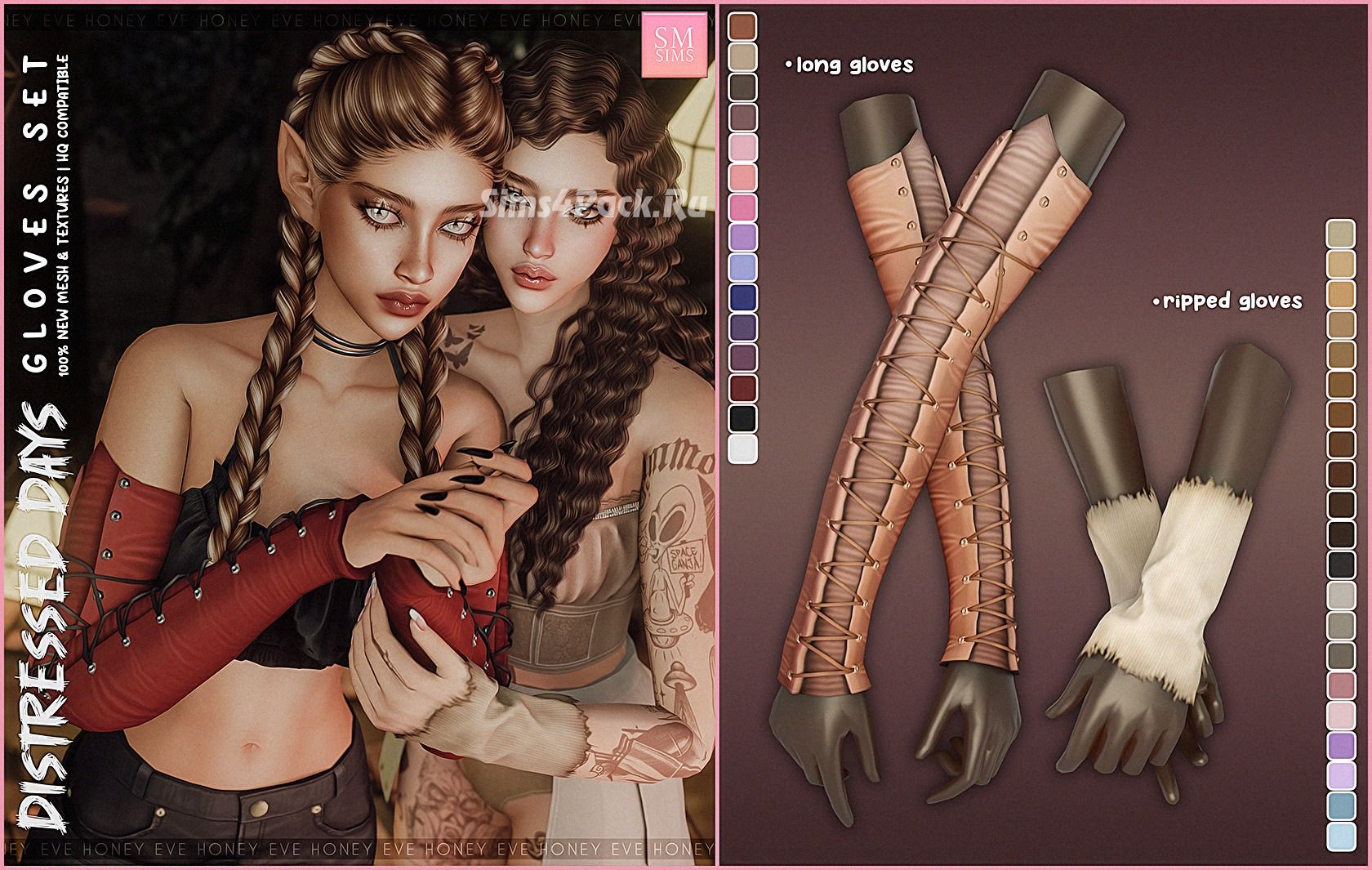 2 элемента: - длинные перчатки-корсеты (15 ц.в.) - рваные митенки (21 ц.в.) HQ совместимы. Доступны для женщин.