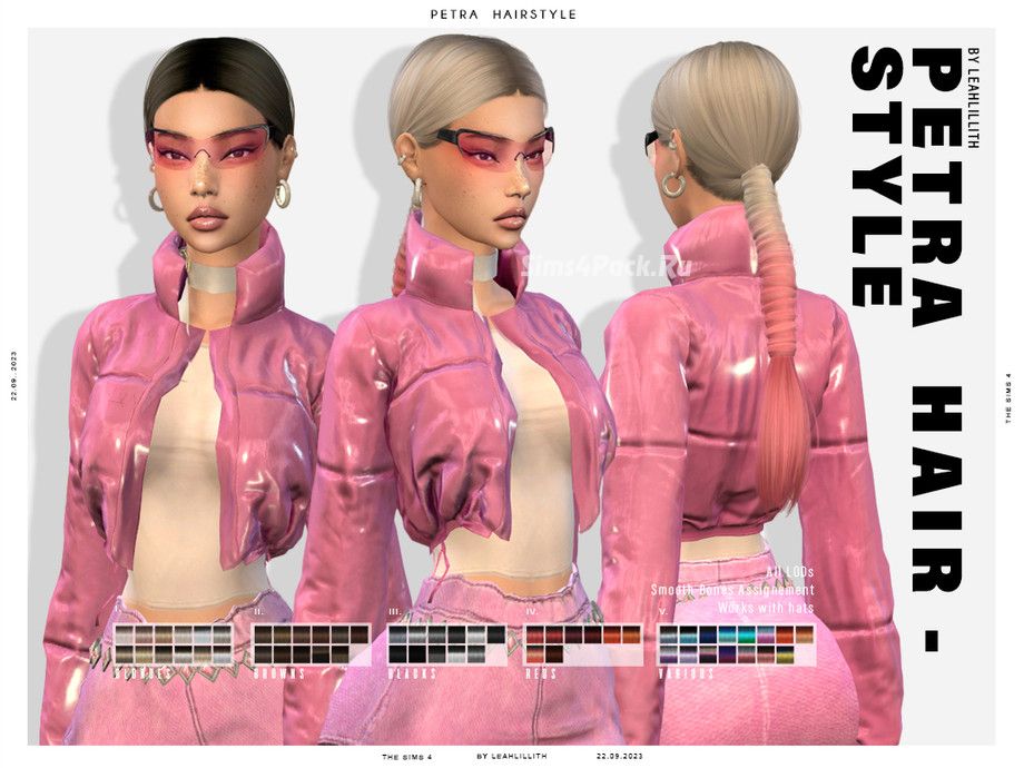 Низкий закрученный хвост с прямым пробором в 97 цветовых решениях. Причёска частично работает с головными уборами. Доступна для женщин.
