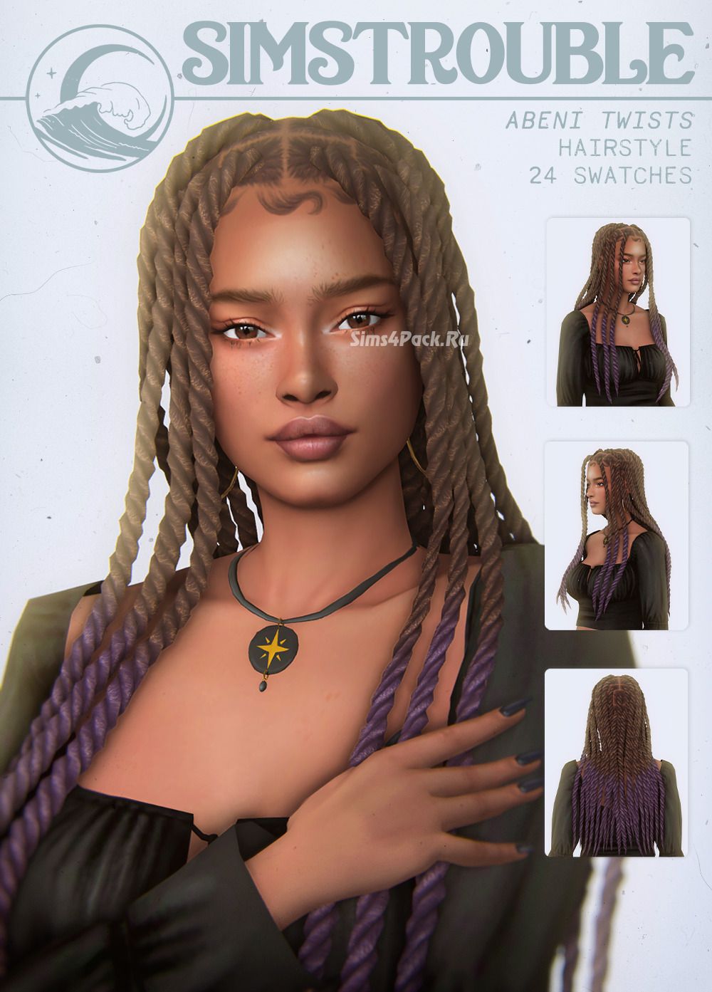 Длинные Maxis Match твисты в 3 версиях, см. картинку 2 и 24 EA свотчах. Добавить эффект омбре можно в разделе Грим. Причёска частично работает с головными уборами. Доступна для женщин.