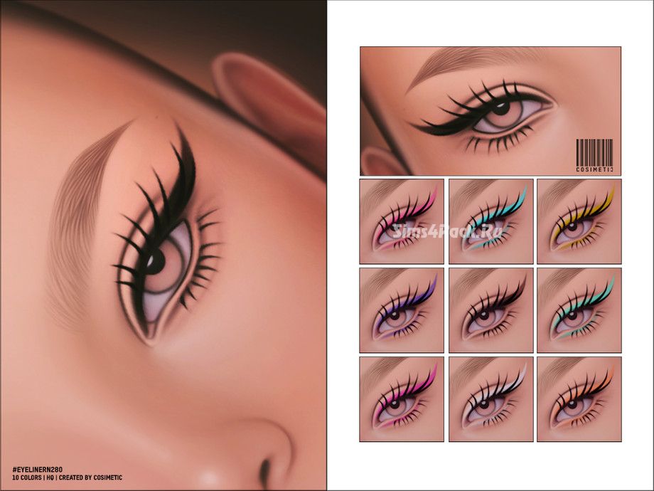 Подводка в стиле «Кошачий глаз» с длинными нарисованными ресницами в 10 свотчах. Maxis Match. Доступна для женщин.