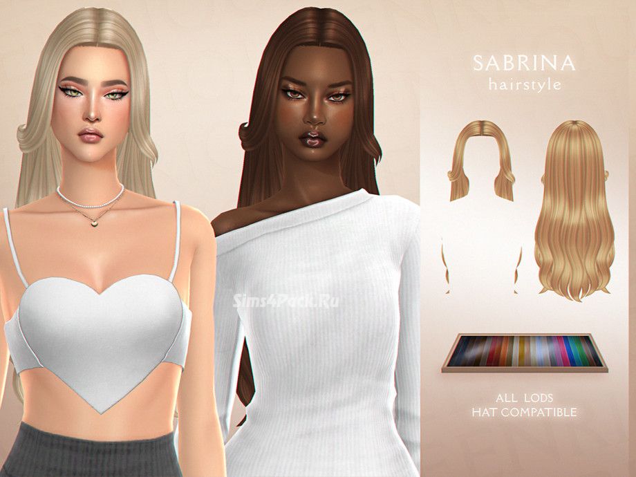 Длинные Maxis Match волосы с чёлкой-шторкой и слегка волнистыми кончиками в 24 EA свотчах. Причёска частично работает с головными уборами. Доступна для женщин.