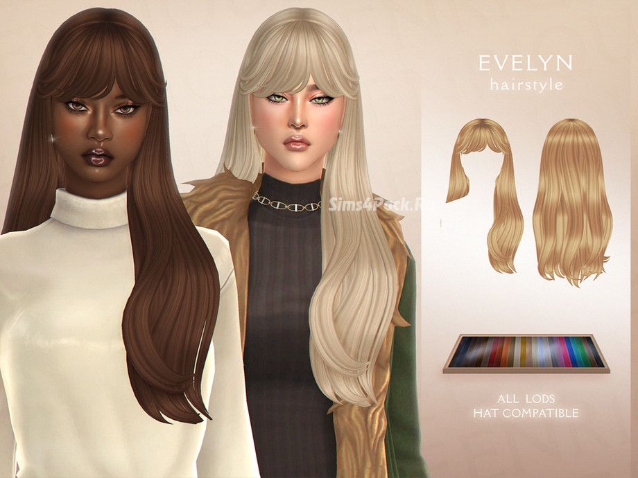 Длинные, слегка волнистые волосы с чёлочкой в 24 свотчах. Причёска частично совместима с головными уборами. Maxis Match. Доступна для женщин.