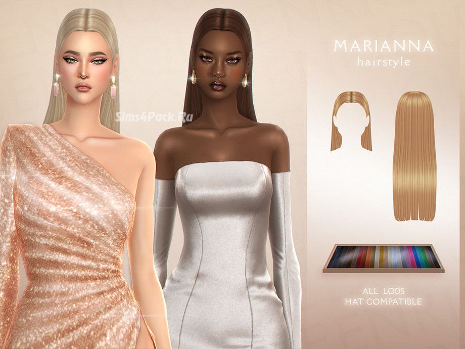 Убранные назад длинные прямые волосы с пробором посередине в 24 EA свотчах. Причёска частично работает с головными уборами. Maxis Match. Доступна для женщин.