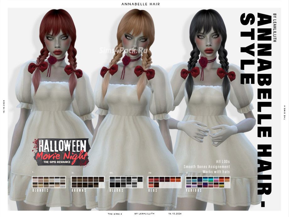 На создание этих косичек с чёлочкой и бантиками (2 ц.в.) автора вдохновила Анабель - второстепенный антагонист фильма Заклятие (2013) и главный протагонист/антагонист приквелов Проклятие Аннабель (2014) и Проклятие Аннабель: Зарождение зла (2017). 98 свотчей. Причёска частично работает с головными уборами. Доступна для женщин.