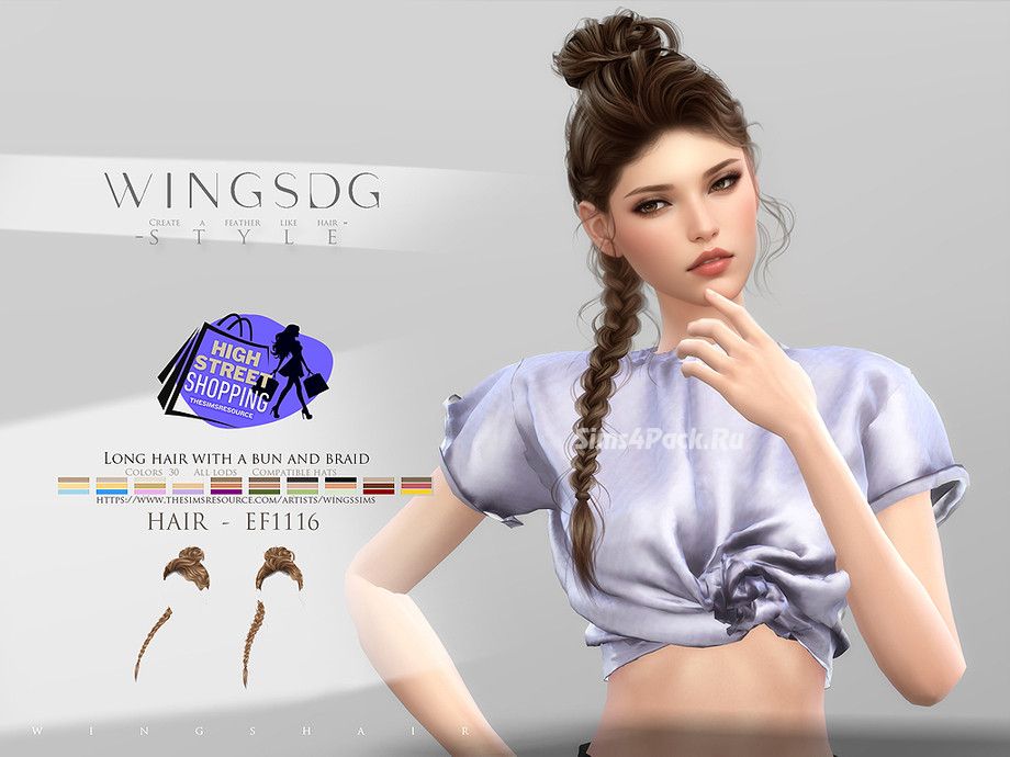 Прическа WINGS-EF1116-Long hair with a bun and braid для Симс 4