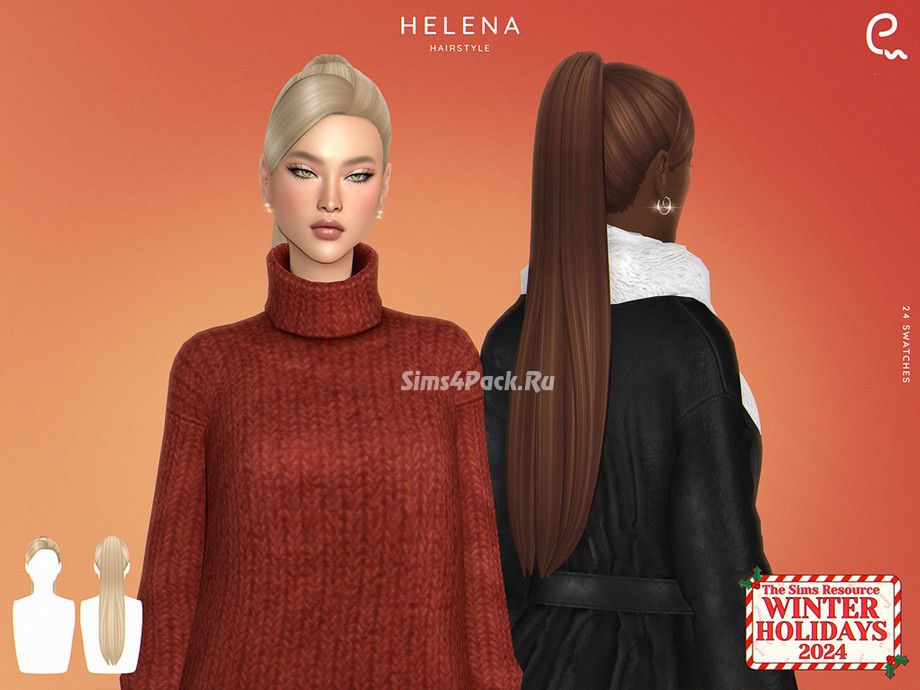 Длинный конский хвост с элегантно уложенной чёлочкой в 24 EA свотчах. Причёска частично работает с головными уборами. Maxis Match. Доступна для женщин.