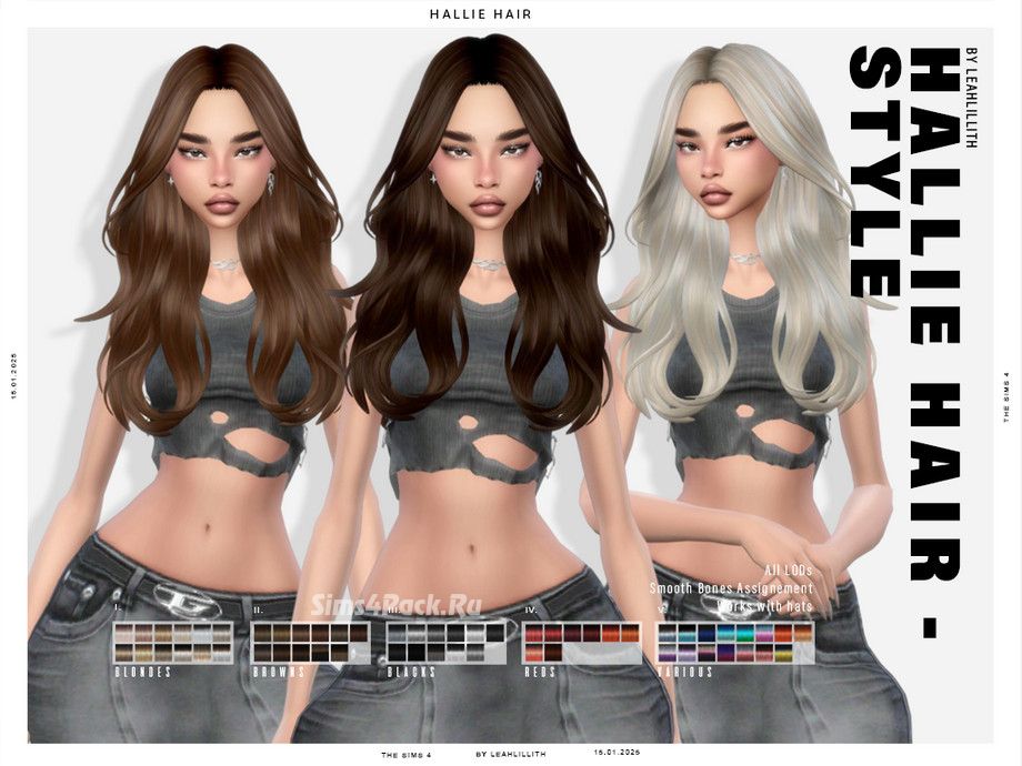 Длинные волнистые волосы, уложенные на прямой пробор, в 24 цветовых решениях. Причёска частично совместима с головными уборами. Maxis Match. Доступна для женщин.