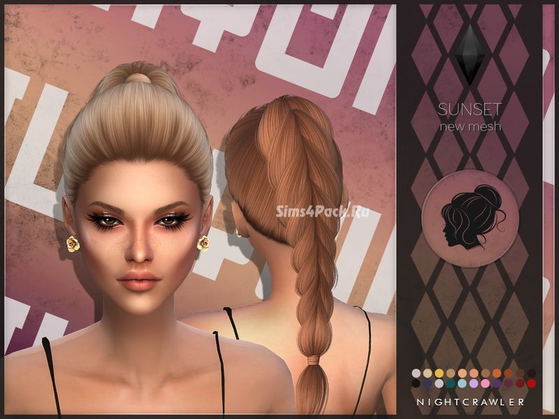 Высокий конский хвост с косой в 22 цветовых вариантах. Прическа частично совместима с головными уборами. Используйте вместе с аксессуаром для волос Sunset Pearls (ссылка в MESH, скачивать необязательно). Доступно для женщин.