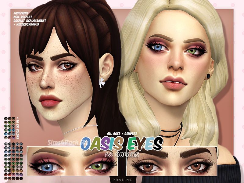 На создание этих линз и глаз автора вдохновил maxis match контент. 4 версии. Глаза (default и non-default, см. раздел Глаза), обычные линзы и линзы с эффектом гетерохромии (см. раздел Грим). 68 (50 авторских и 18 default EA цветов) для всех полов и возрастов.