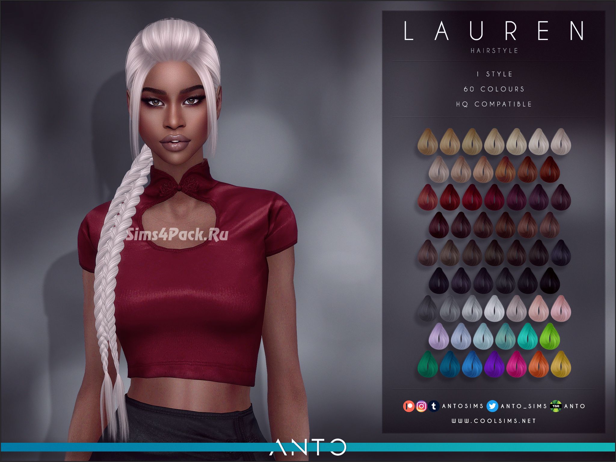 Интересная прическа с двумя длинными косами и выпущенными передними прядками в 60 цветовых вариантах. Прическа частично работает с головными уборами. HQ совместима. Доступно для женщин.