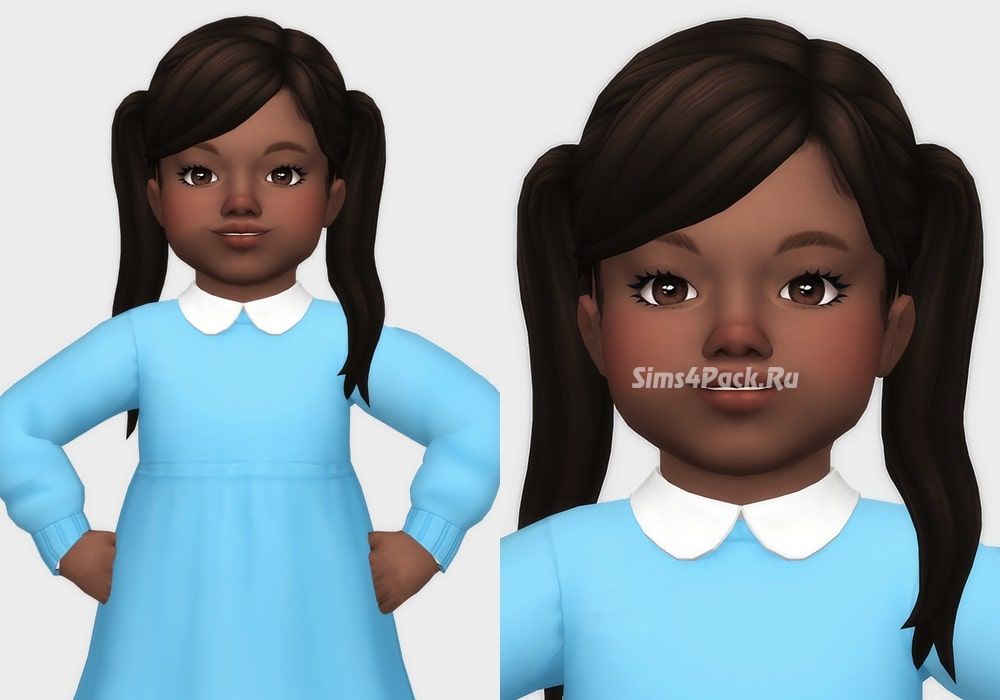 Симпатичные Maxis Match хвостики + челочка, уложенная на бок, в 16 EA цветовых образцах. Прическа почти не совместима с головными уборами. Доступна для малышек тоддлеров.