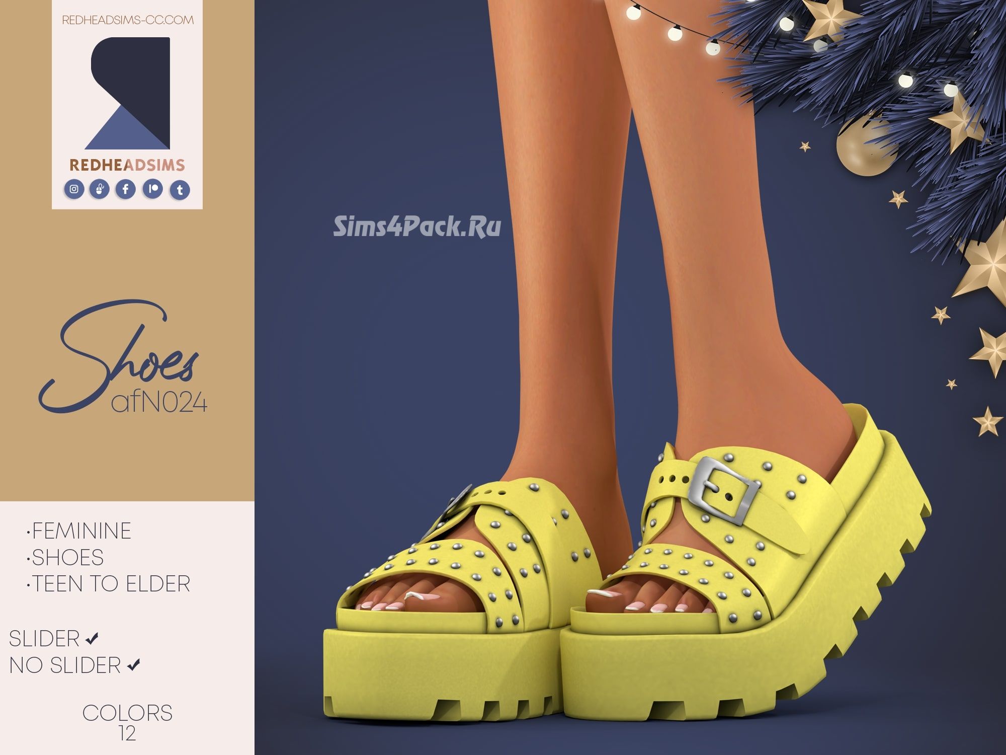 Современные модные шлепанцы на платформе с декоративными металлическими заклепками и пряжкой в 2 версиях (стандартная и с увеличенной платформой) и 12 цветовых образцах. Совместимы с HQ модом. P.S.: для второй версии НЕОБХОДИМ слайдер-мод для высоких каблуков CAS Feet Up Boots Heels Slider 01 (ссылка после описания в графе MESH). Доступно для женщин.