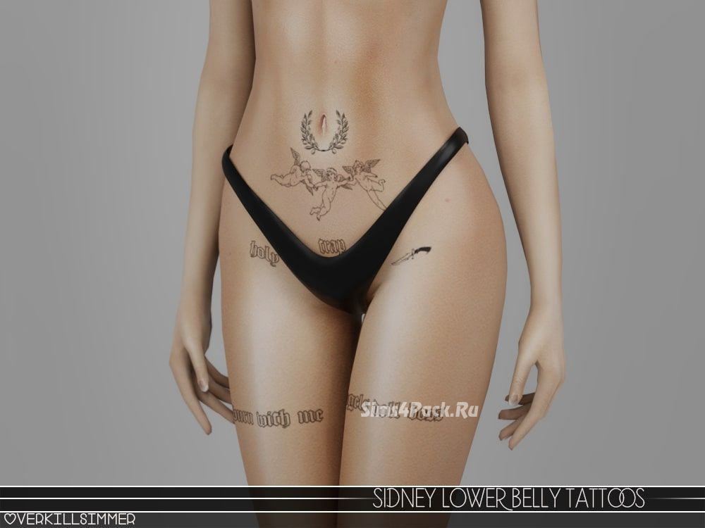 Татуировки внизу живота и на бедрах с изображением ангелков, надписей, ножа и лаврового венка. 1 цветовое решение. HQ совместимо. Доступно для женщин и мужчин.