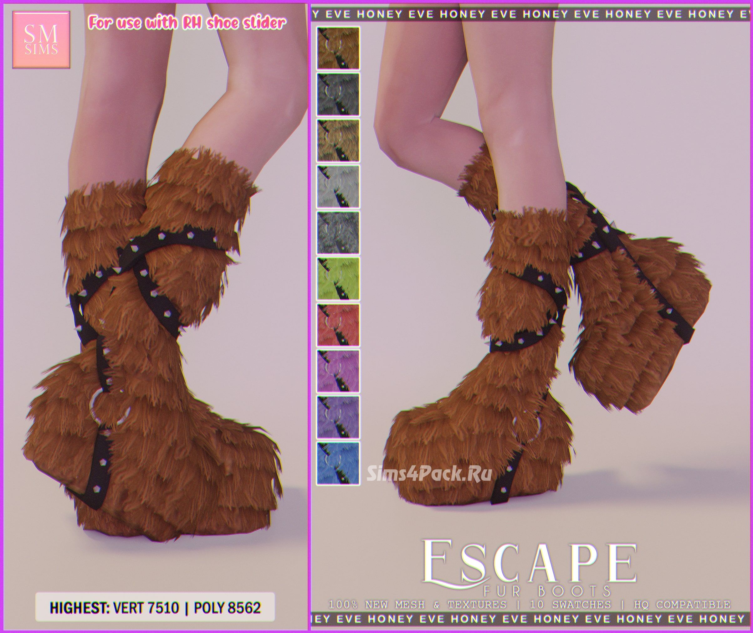 Неформальные женские меховые сапоги длинной до колена с кожаными ремнями в шипах. 10 цветовых образцов. HQ совместимы. P.S.: автор советует использовать вместе со слайдером-модом для высоких каблуков CAS Feet Up Boots Heels Slider 01 от REDHEADSIMS (ссылка после описания в графе Mesh).
