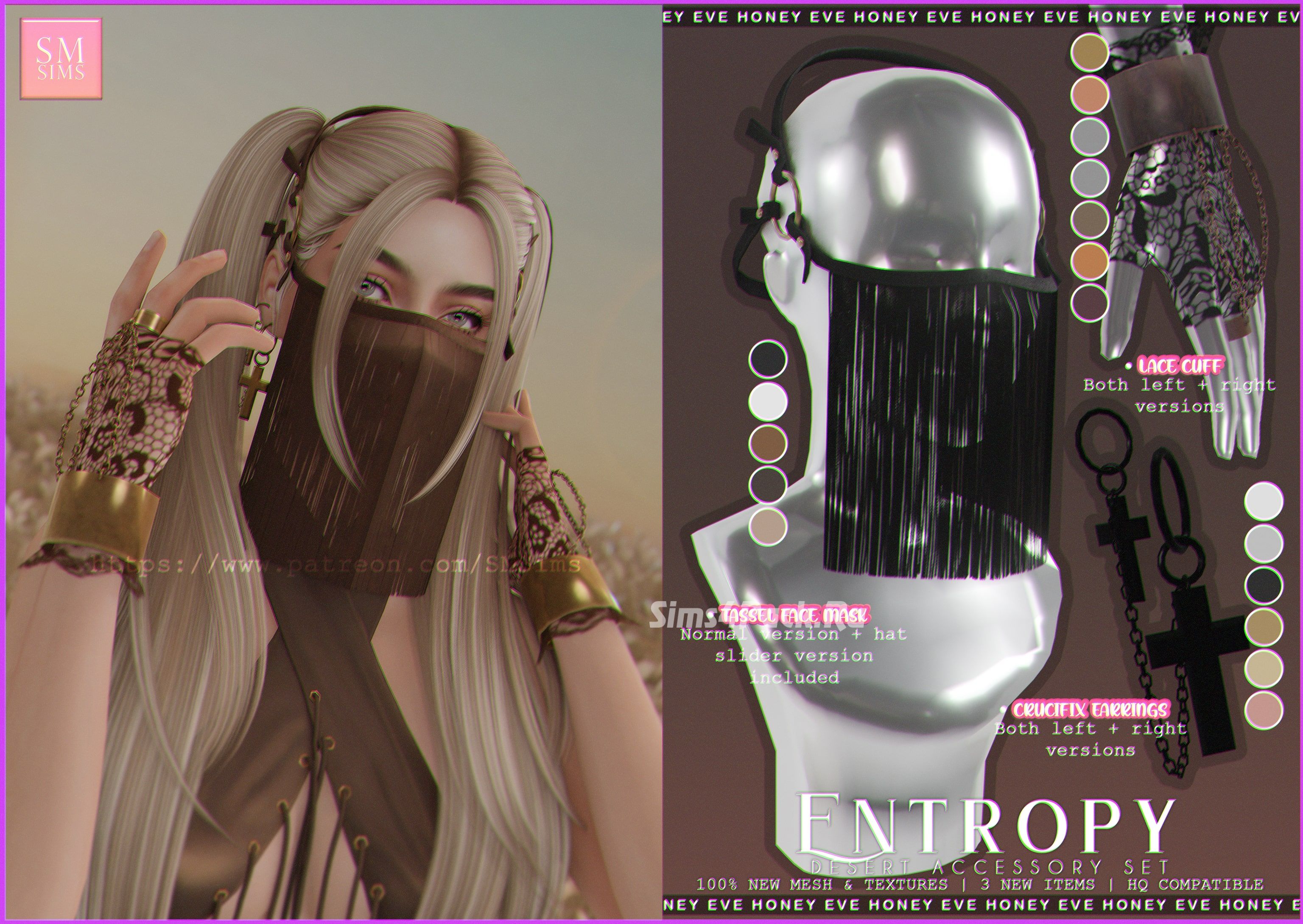 3 элемента: - серьги-крестики в 3 позициях (слева, справа и на обоих ушах) и в 6 ц.в. - маска для лица в 2 версиях (одна работает со слайдером для головных уборов, а другая нет) и в 15 ц.в. - кружевные митенки с браслетами в 2 позициях (на правую и на левую руку, см. раздел Браслеты) и в 12 опциях (митенки с браслетами и просто браслеты в цветовой палитре автора) Всё HQ совместимо. Доступно для женщин и мужчин.