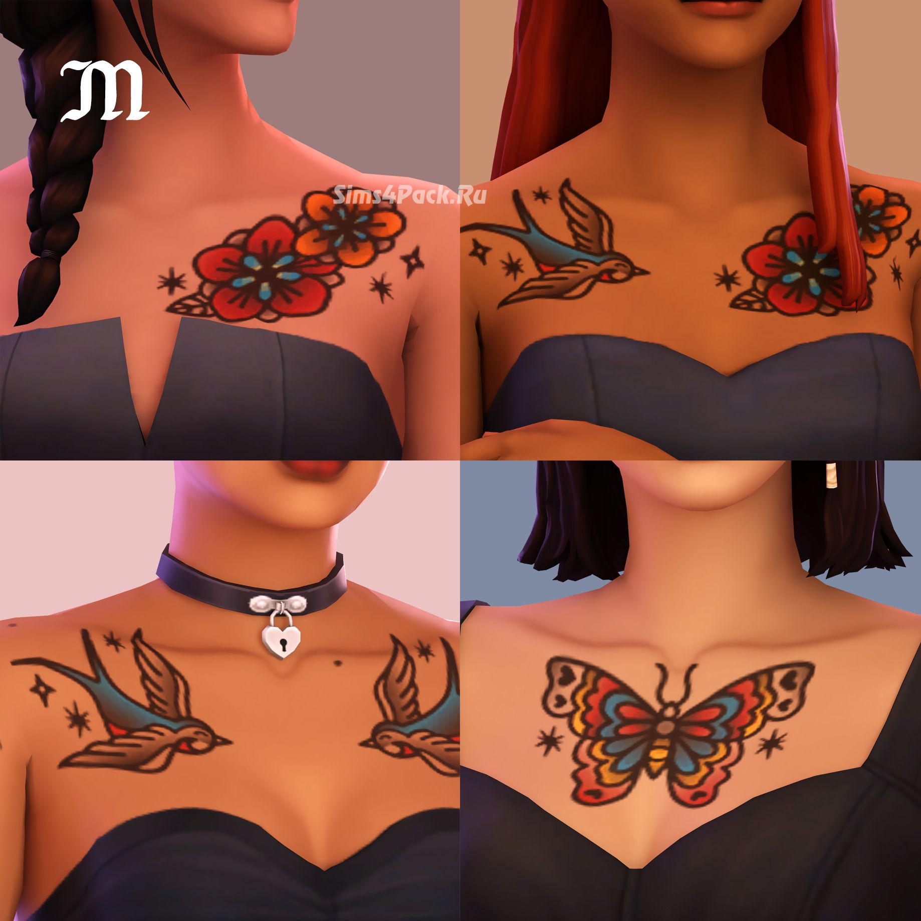 Яркие цветные Maxis Match татуировки для груди в 6 свотчах. Доступны для женщин и мужчин.