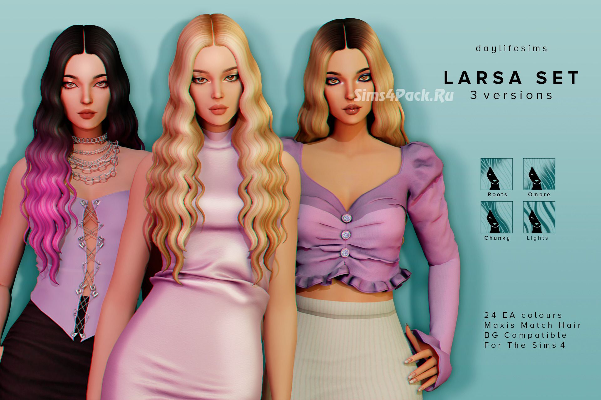 Длинные волнистые Maxis Match волосы в 3 версиях (см. картинки 3, 4 и 5) и 2 вариантах (ровный цвет волос и отросшие корни, см. раздел Волосы), также доступны 3 типа окрашивания (омбре, мелирование и контрастные передние пряди, см. раздел Аксессуары). Прическа частично работает с головными уборами. Доступна для женщин.