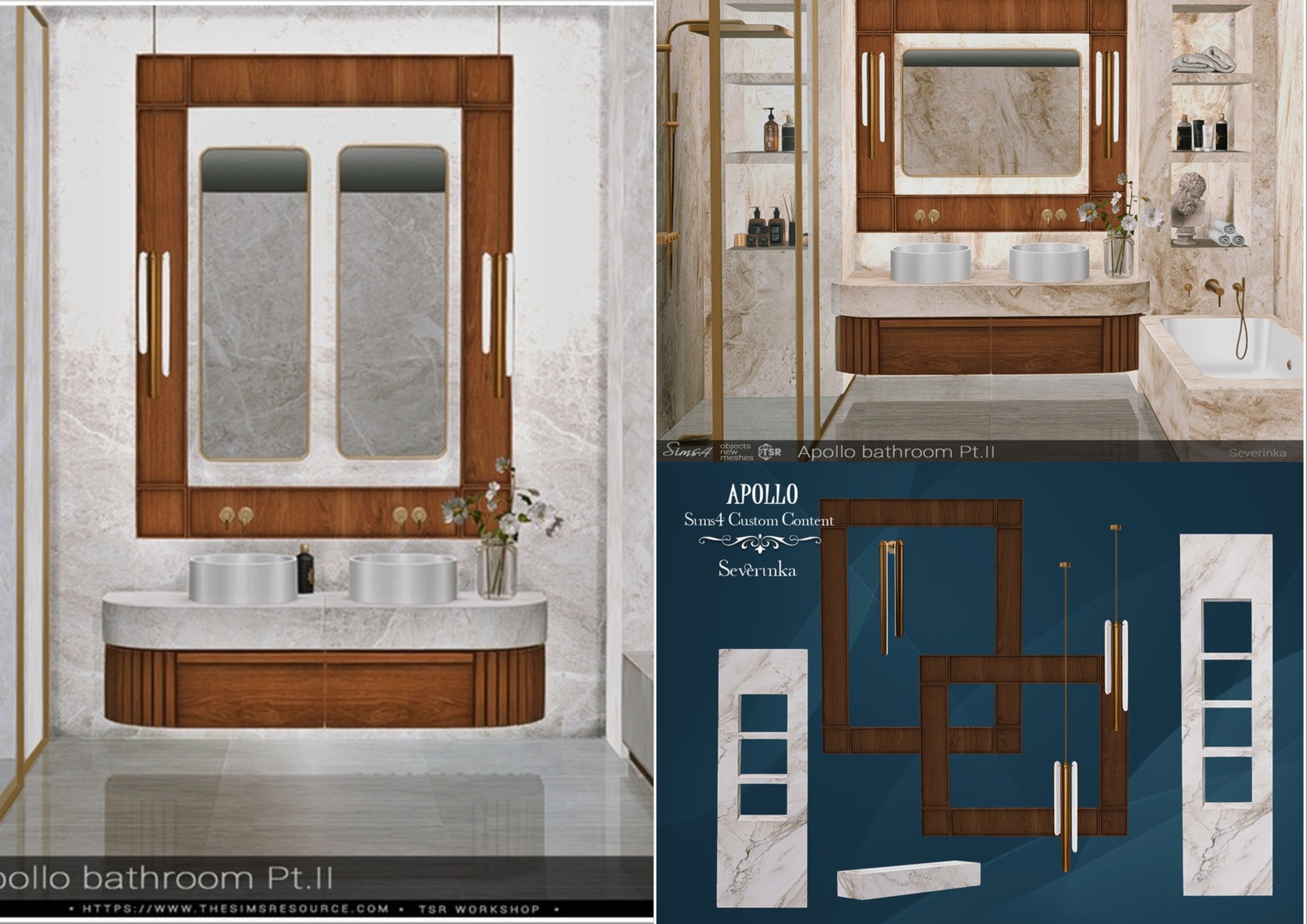 Комплект мебели и декора для ванной комнаты в современном стиле. Для низких и средних стен. Комплект выполнен в 4 цветах с имитацией натурального мрамора. Для создания завершенной обстановки используйте мраморные стены «Аполлон». 8 предметов: мраморная полка для ванной комнаты, витрина, подвесные светильники, настенные светильники, деревянные настенные панели.
