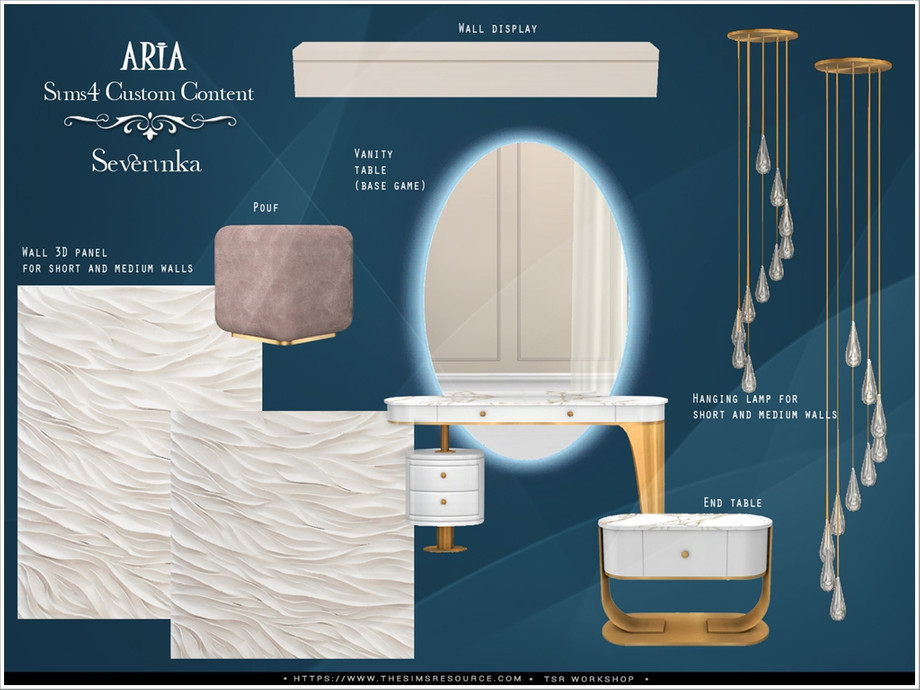Это набор из 8 творений Комплект мебели и декора для гостиной в неоклассическом стиле. 8 предметов: туалетный столик, пуф, подвесной светильник (для низких и средних стен), настенная 3D-панель (для низких и средних стен), настенный дисплей, приставной столик. Туалетный столик полностью функционален для базовой игры. Подвесные светильники не исчезают в режиме опущенных стен. ОСНОВНАЯ ИГРА