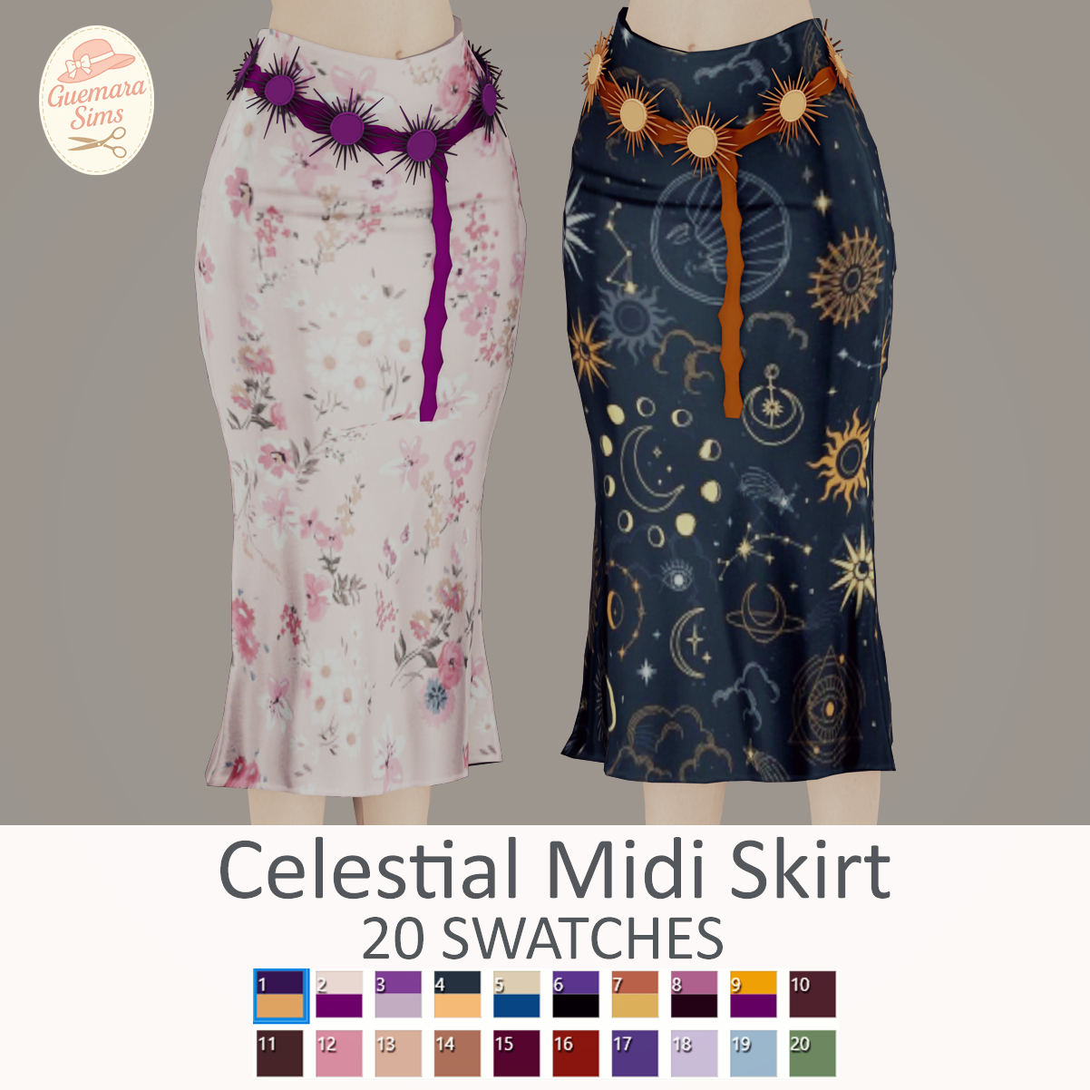 Струящаяся юбка миди с волшебным оттенком, представленная в 20 образцах Maxis Match: от нежных цветочных до космических узоров. Каждый фасон дополнен поясом с небесным солнцем, который добавит мистического очарования любому образу. Идеально подходит как для повседневной носки, так и для создания очаровательных образов!
