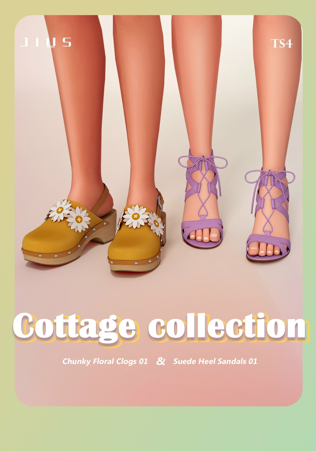 Женская обувь Cottage collection 02.1 для Симс 4 🌼 Автор: Jius 2 элемента: - сабо на невысоком каблуке с цветочками (8 св.) - замшевые босоножки с завязочками (35 св.) HQ. Доступно для женщин.
