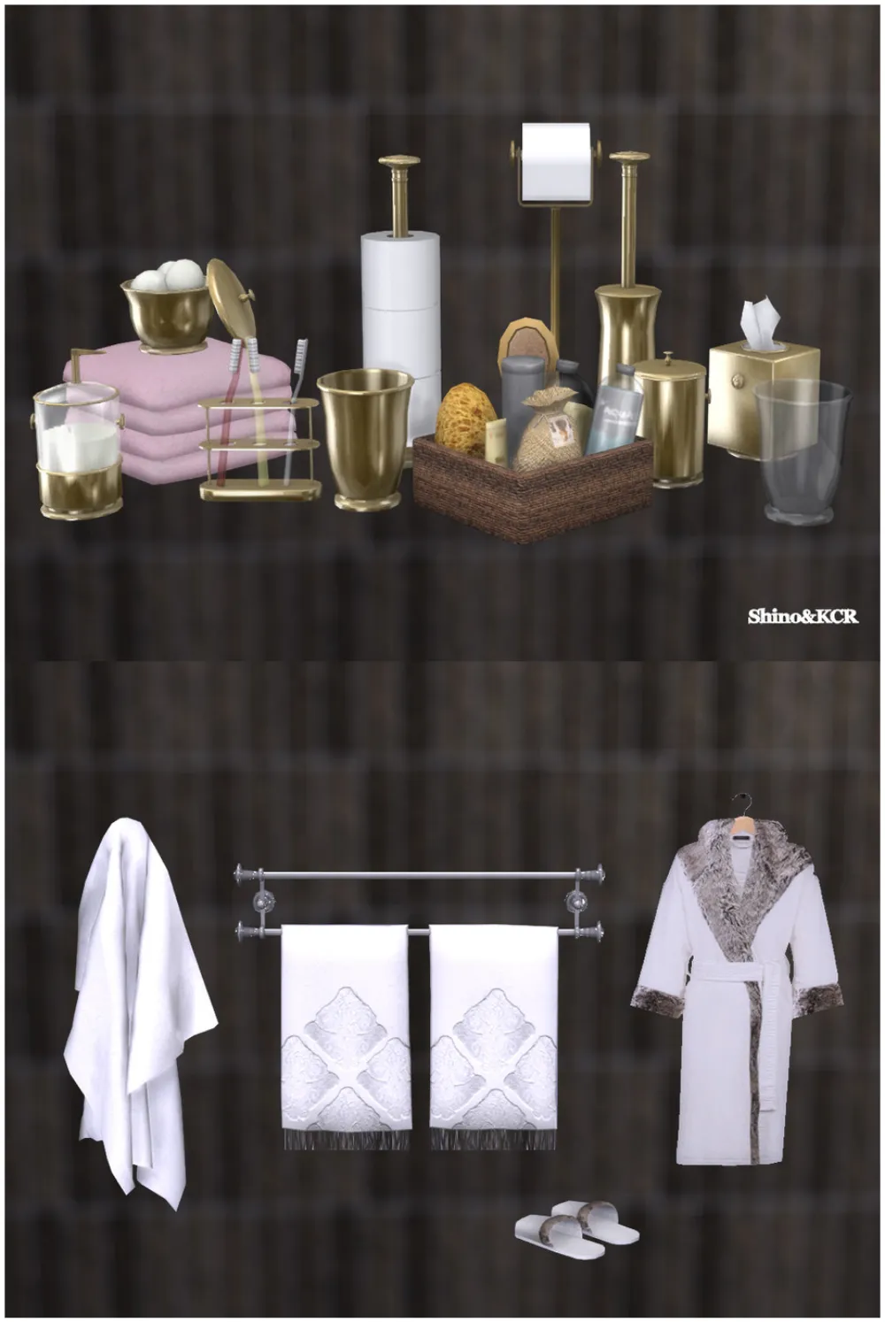 Декоративные предметы для ванной комнаты в стиле Potterybarn,включая: - Банный халат в настенных скульптурах - Тапочки - Контейнер- Подставка для мылаr - Стеклянная и металлическая кружка - Держатель для зубных щеток - Салфетки - Большое и настольное мусорное ведро (только декоративные предметы ) - Держатель для бумаги, подставка для бумаги, ёршик для унитаза - Настенное полотенце в настенных скульптурах - Подставка для полотенец с 3 различными текстурами в настенных скульптурах - 2 стопки полотенец (большая и маленькая) - Спа-корзина . Все объекты являются базовыми для игры. Пожалуйста, убедитесь, что ваша игра полностью обновлена, иначе объекты могут не отображаться в игре.