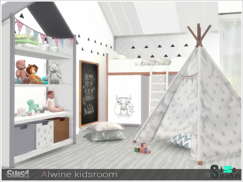 Мод для Sims 4 - набор интерьера для детской в скандинавском стиле, включает в себя все элементы на изображении