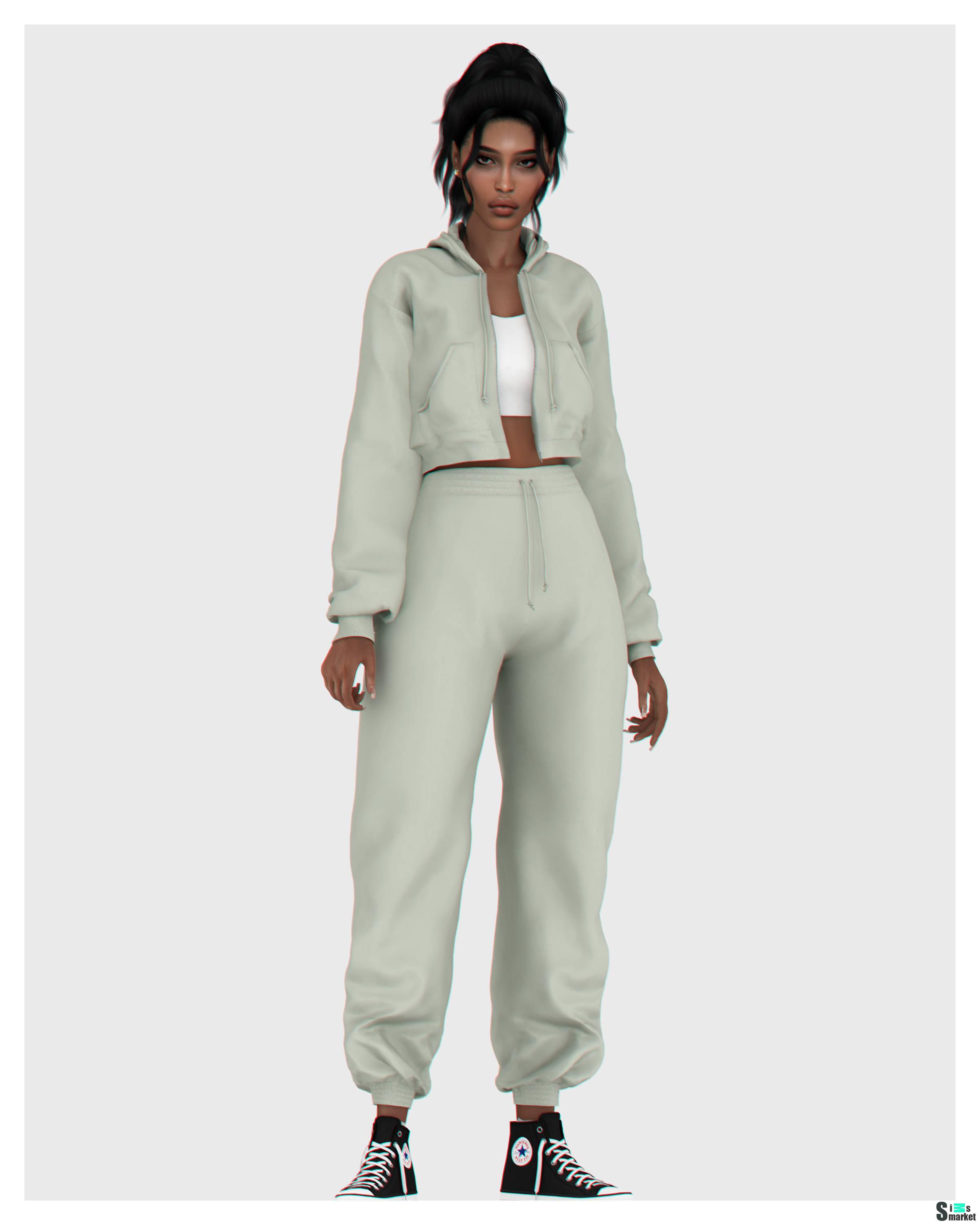 Укороченная спортивная кофта с капюшоном (Верхняя часть одежды, 20 ц.в.) и топом (цвет можно изменить в разделе Перчатки, 8 ц.в.) + комфортные спортивные штаны с высокой посадкой (Нижняя часть одежды, 20 ц.в.). Всё HQ совместимо. Доступно для женщин. Проверено на лицензионной версии: 1.100.147.1030