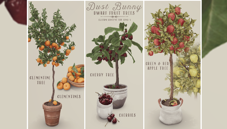 Карликовые плодовые деревья 😋Клементиновое дерево😋 Находится в разделе «Декорации» -> «Растения». 😋Клементины😋 Находится в разделе «Декор» -> «Беспорядок». 😋Вишневое дерево😋 Находится в разделе «Декорации» -> «Растения». 😋Вишни😋 Находится в разделе «Декор» -> «Беспорядок». 😋Яблоня😋 2 образца Находится в разделе «Декорации» -> «Растения». Весь наш контент можно найти в режиме «Строительство и покупка», выполнив поиск по запросу «Dust Bunny».
