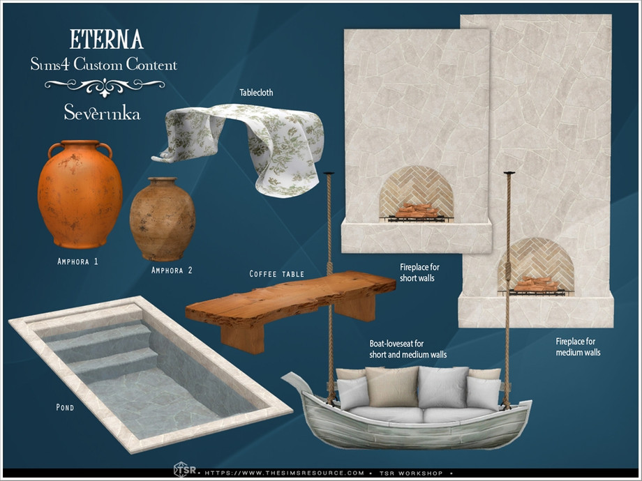 Комплект мебели и декора для оформления средиземноморского патио. 9 предметов: ☀камин (для коротких и средних стен), ☀подвесная кушетка-лодочка (для коротких и средних стен), ☀пруд, ☀журнальный столик, ☀скатерть, ☀два амфрая. 🌴 Что нужно для установки пруда? используйте код bb.moveobjects🌴