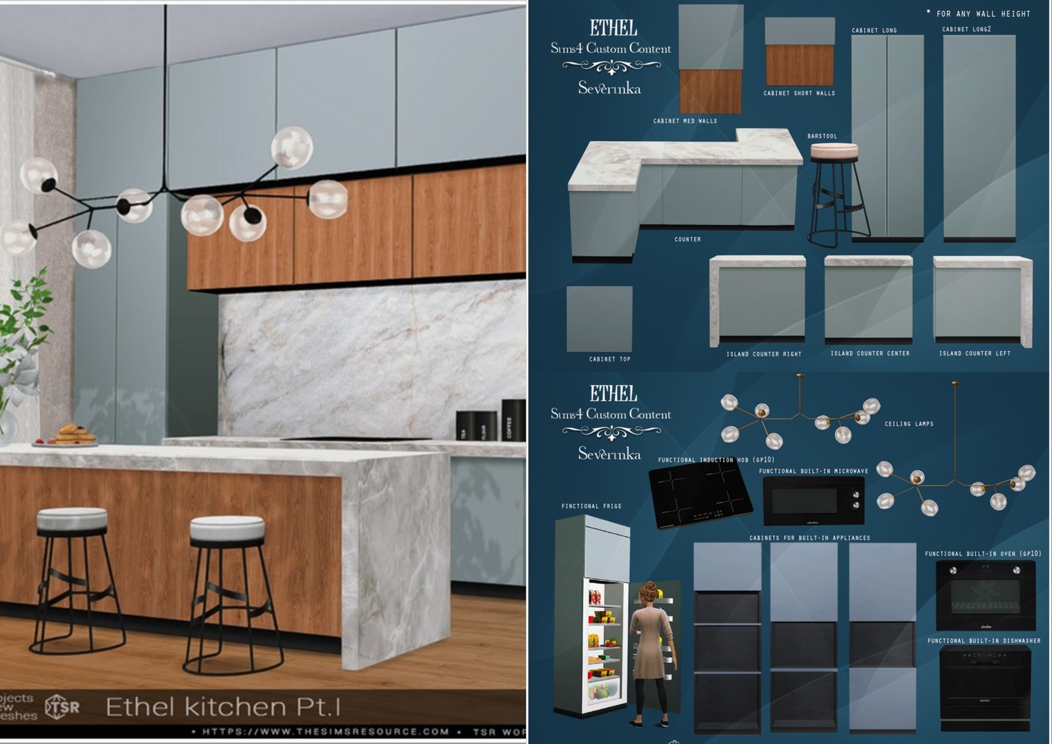 Комплект современной кухонной мебели. Современная кухня с гладкими матовыми фасадами в сочетании с текстурой дерева и серого мрамора. Изысканное сочетание цвета и фактур по последним современным тенденциям. Разнообразие навесных шкафов позволяет собрать кухонный гарнитур под любую высоту стены. Кухня оснащена функциональной встроенной техникой. Часть I - мебель: шкафы, столешницы, остров и барный стул. Часть II - светильники, кухонные шкафы для встроенной техники, а также встроенная кухонная техника - холодильник, индукционная варочная панель, духовой шкаф, посудомоечная машина и микроволновая печь. Вся техника функциональна (микроволновая печь имеет небольшой люфт при нажатии кнопок из-за высоты установки).