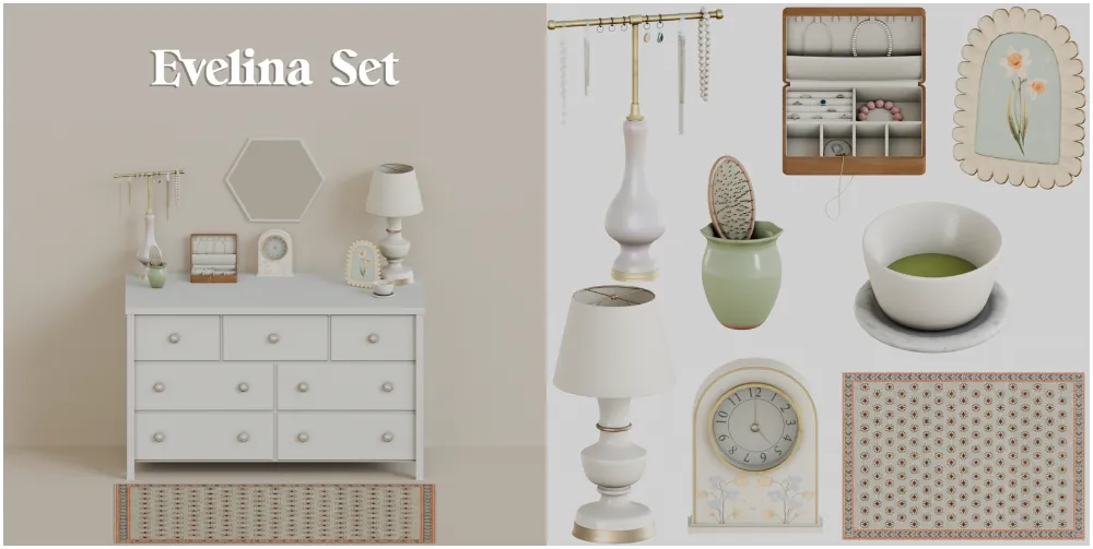 Банка для кистей | 8 образцов | 9 тыс. полигонов Часы | 5 образцов | 1,6 тыс. полигонов Чашка | 1 образец | 3,4 тыс. полигонов Комод | 8 образцов | 5,5 тыс. полигонов | 120 слотов Рамка | 12 образцов | 7,9 тыс. полигонов Шкатулка для украшений | 8 образцов | 13 тыс. полигонов Подставка для украшений | 4 образца | 10 тыс. полигонов Лампа | 8 образцов | 9,1 тыс. полигонов Зеркало | 8 образцов | 142 полигона Ковер | 3 образца