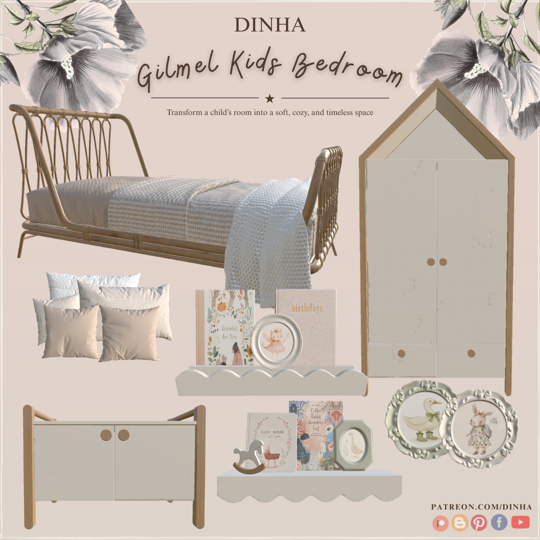 Представляю вашему вниманию мой новый набор — мягкий и вневременной комплект мебели для детской спальни, включающий уютную кровать, шкаф, небольшой комод и полки, украшенные рамками, книгами и игрушкой. Кровать и рамки для картин доступны в двух цветах для The Sims 4: бело-бежевом и нежно-зеленом, что позволяет создавать как нейтральные, так и мягкие интерьеры в природном стиле. Акценты из натурального дерева создают спокойную, теплую и очаровательную атмосферу для детей.
