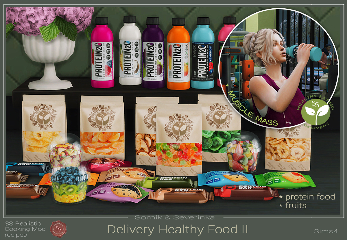 Часть 2 является дополнением к части 1 доставки Здоровой Пищи. Информация: BG27 съедобных закусок и напитков Совместимо со всеми другими модами. Все закуски поддерживают здоровый образ жизни, имеют свои уникальные бонусы и небольшое количество калорий, а фрукты в стаканах также помогут в снижении веса. Включено:Протеиновые батончики - 6 шт. Протеиновые печенья - 6 шт. Протеиновые коктейли - 6 шт. Протеиновые батончики, печенья и коктейли полезно пить/есть ПЕРЕД силовыми тренировками - это поможет вашему симу быстрее наращивать мышечную массу. Без тренировок они сами по себе не наращивают мышцы - это всего лишь здоровые закуски с низким содержанием калорий. Сушеные фрукты - 6 шт Здоровый перекус, низкая калорийность, не имеет срока годности Фрукты в чашках - 3 шт Имеют срок годности и небольшое отрицательное содержание калорий (помогают в снижении веса)Симы едят десертной ложкой Доступно в ресторане ИНСТРУКЦИЯ ПО УСТАНОВКЕ Установите 1 часть доставки Здоровой еды Установите 2 часть доставки из публикации Первая часть может работать самостоятельно, вторая часть только в сочетании с первой Если ваша доставка не отображается:Проверьте, установлена ли 1 часть доставки У вас установлен XML инжектор (не устанавливайте его глубоко в папки, игра не сможет его увидеть) Проверьте галочку в настройках игры - что скриптовые моды включены