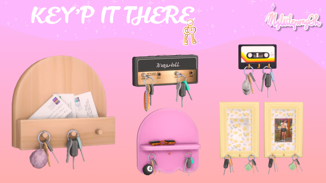 Мой мини-набор «KeyP It There» — это небольшая дань уважения тем из нас, у кого СДВГ, и кому нужно отдельное место для таких важных вещей, как ключи, — ведь если их нет, значит, их нет! Только не забудьте захватить их, когда будете уходить — мы уже это делали 😆! Все предметы совместимы с базовой игрой. Полка для ключей 1 - 9 образцов - Также работает как знак снятия обуви, если у вас есть снежный побег (но это все еще предмет базовой игры, не волнуйтесь!) Полка для ключей 2 - 9 образцов - имеет один декоративный слот для маленьких и средних предметов! Key-Fi — 6 образцов — просто красиво и весело KeySette — 4 образца — просто красиво и весело KeyFrame - 8 образцов - в него можно вставить небольшую картинку