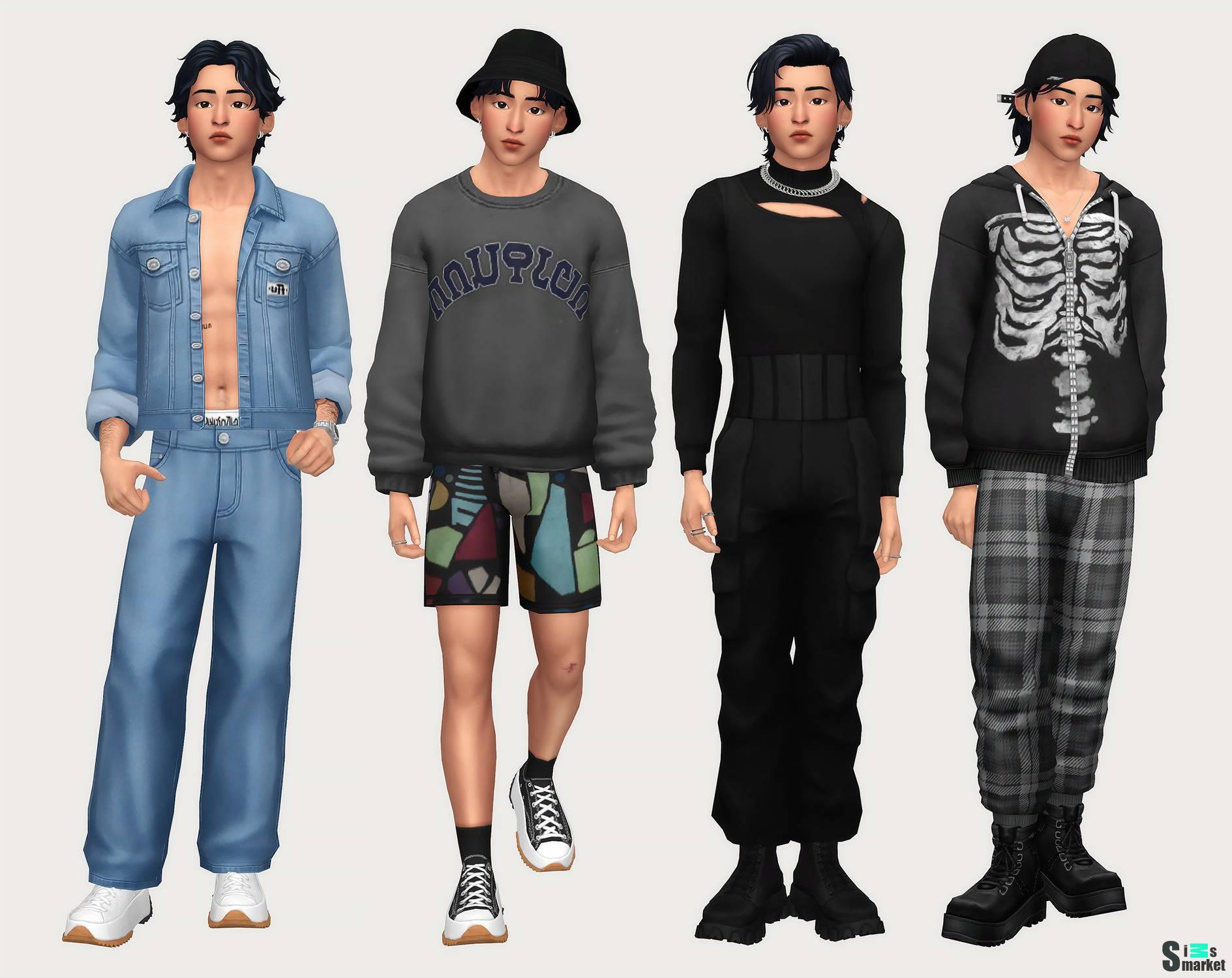 Коллекция Maxis Match одежды для симов. 9 объектов: - худи на молнии с капюшоном (13) - худи на молнии с капюшоном и водолазкой (14) - расстёгнутая джинсовая куртка с закатанными рукавами (20) - расстёгнутая джинсовая куртка с сильно закатанными рукавами (20) - базовый свитшот (12) - креативная модель водолазки с декоративными вырезами (6) - свободные штаны с приподнятыми штанинами (9) - широкие джинсы с бельём (20) - базовые шорты (10, доступны также для женщин) Доступно для мужчин. Проверено на лицензионной версии игры: 1.97.62.1020