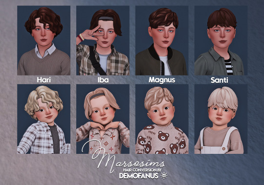 Авторство [Demofanus] Marsosims Я подготовила небольшой подарочек для вас и ваших пиксельных мальчишек! Конвертации 4 причесок прекрасной marsosims для детей и тоддлеров, каждая из которых определенно имеет свой характер 🤍 ✨Совместима с базовой игрой ( кроме Магнуса — требуются материалы для кинотеатров!!! ) ✨24 цвета EA, все уровни детализации ✨Совместима с шляпой ✨Оригинальная сетка НЕ требуется ✨ Hari | Ребенок | Малыш ✨ Iba | Ребенок | Малыш ✨ Magnus | Ребенок | Малыш ✨ Santi | Ребенок | Малыш