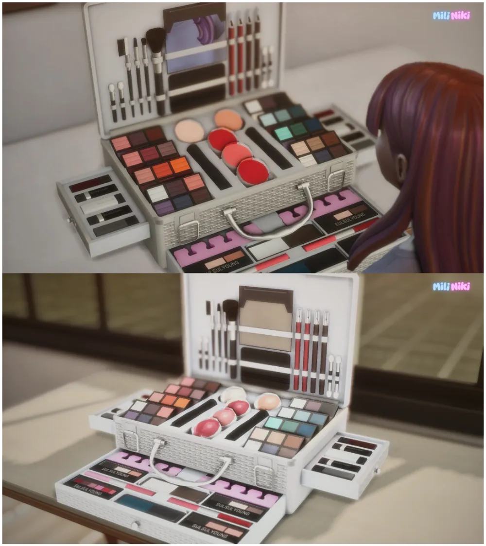 Большой металлический косметический кейс Возвращение к истокам, возвращение к красоте! Будучи миллениалом, я почти ничего не знала о макияже — поэтому профессиональный набор косметики, подобный этому, казался мне волшебной коробочкой, а визажисты — настоящими волшебниками. 🙂 Этот большой металлический косметический кейс — настоящая легенда среди профессиональных визажистов, сочетающий в себе металлический стиль, организованность и практичность. Пусть ваши симы заново откроют для себя этот винтажный набор косметики — их бьюти-рутина станет как путешествие во времени и уже никогда не будет прежней. 💄✨