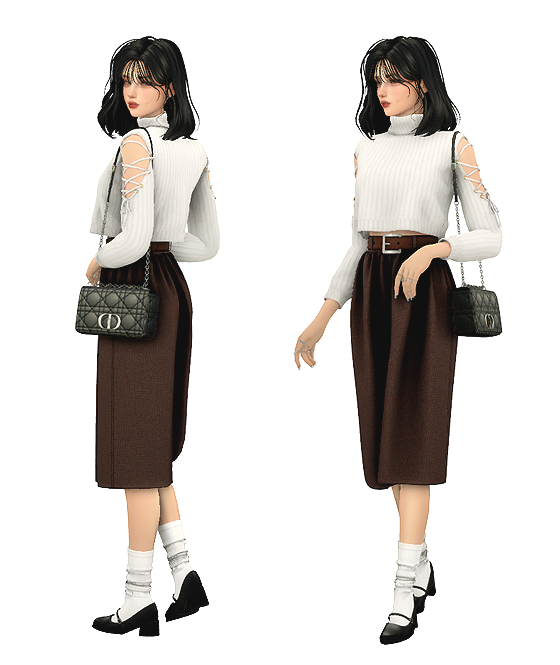 Автор образа thekims4 В архиве вы найдете: - Кофточка с завязками на плечах - Юбка с поясом - Сумка аксессуар - Носочки - Обувь