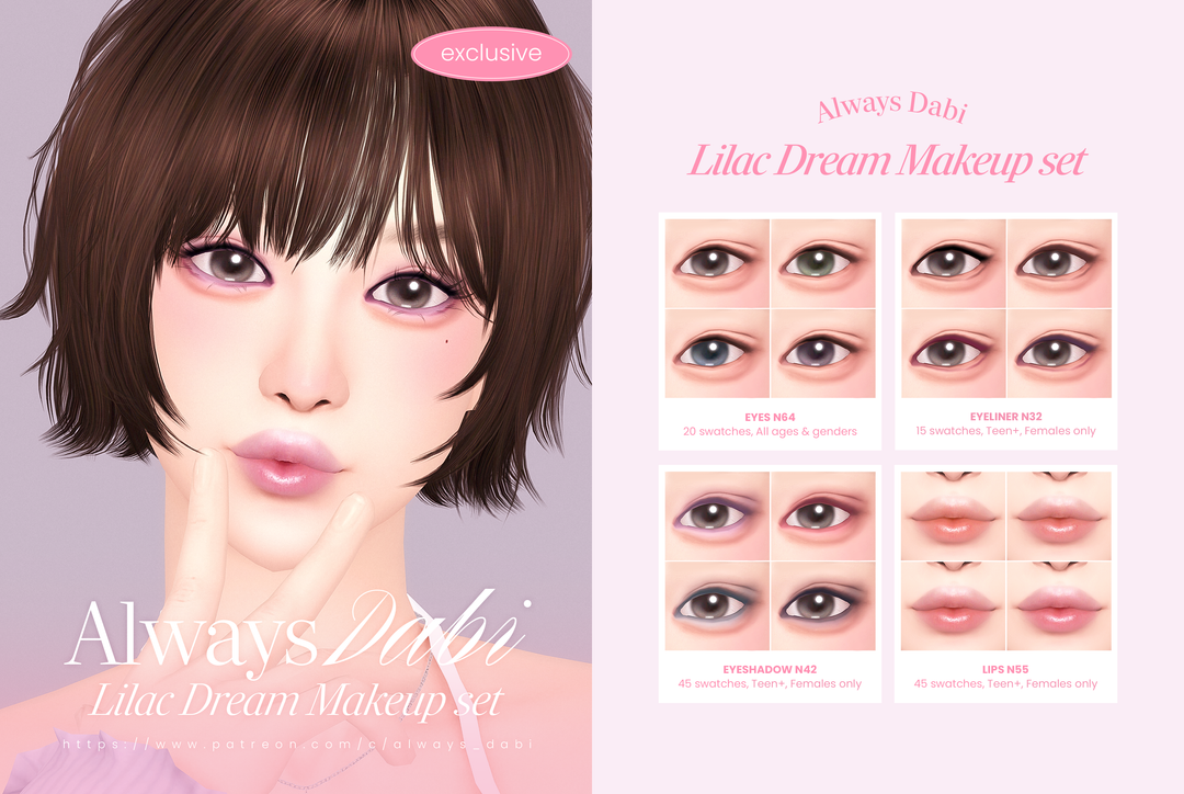 👑 Эксклюзивный набор косметики CC – Lilac Dream 🔗 Тени для век N64 (эксклюзивный CC-оттенок) – 20 свотчей, для всех возрастов и полов. Подводка для глаз N32 (эксклюзивный оттенок CC) – 15 свотчей, для подростков и старше, только для женщин. Тени для век N42 (эксклюзивный CC) – 45 свотчей, для подростков и старше, только для женщин. Помада N55 (эксклюзивный CC-оттенок) – 45 свотчей, для подростков и старше, только для женщин.