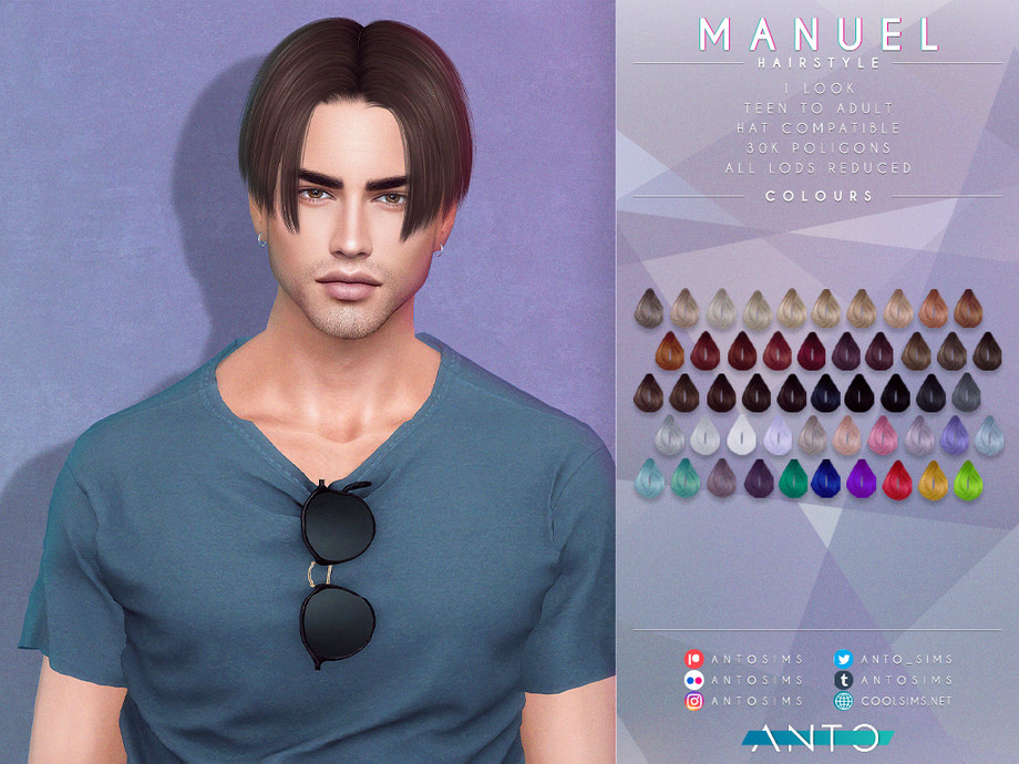 Мужская прическа средней длины со средним пробором. Доступно 50 оттенков волос. Оригинальное название Manuel Hairstyle от Anto. Причёска частично работает с головными уборами. В наборе так-же прическа для детей