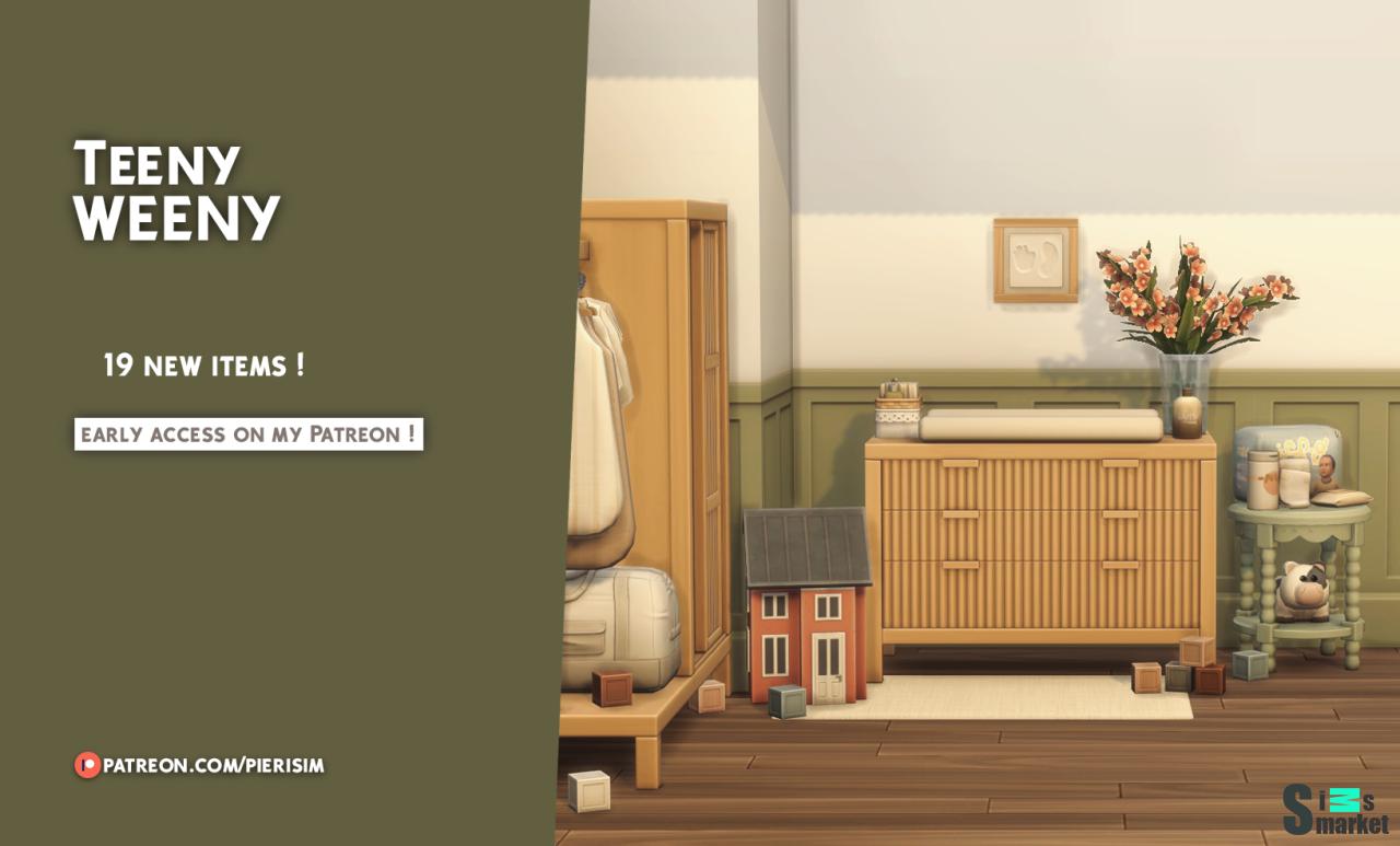 Вот коллекция, посвященная предметам для малышей и младенцев! Вас ждут новые изысканные игрушки, кроватки, комоды, пеленальные столики и многое другое, как вы можете увидеть в предварительном просмотре! Набор выходит с небольшой задержкой, но я надеюсь, что вам понравится украсить комнату для ваших малышей с его помощью 🥰 Вы можете найти эти предметы, ища по названиям Teeny Weeny или Pierisim в игре. Некоторые предметы используют одинаковые текстуры, поэтому убедитесь, что в папке с модами у вас есть пакеты, оканчивающиеся на texture :). Все совместимы с базовой игрой, за исключением пеленального столика, для которого требуется дополнение Растем Вместе.
