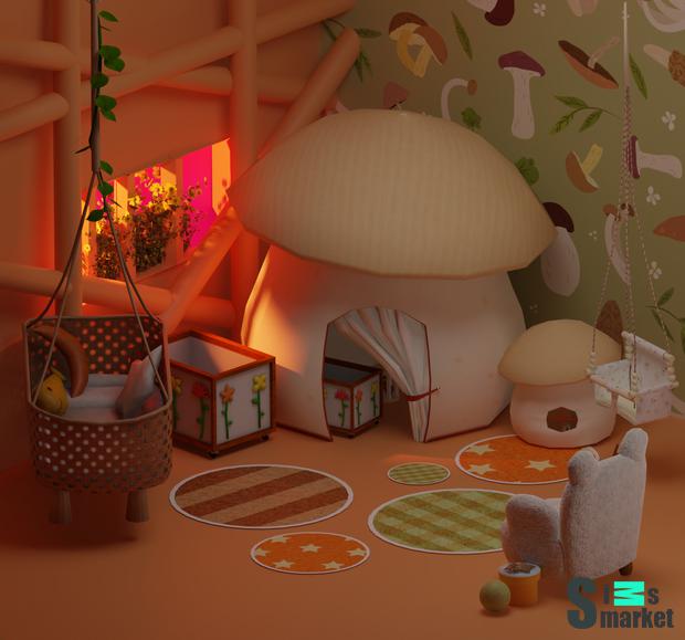 Мод для Sims 4 - забавный набор мебели для ваших детских комнат <3 Что включено: - Функциональная кроватка - Функциональный стульчик для кормления. - Функциональный диван - Коврик (доступен в 11 симпатичных образцах) - Палатка - Игровая приставка - Растительное украшение - Декорирование бревен - Грибные обои