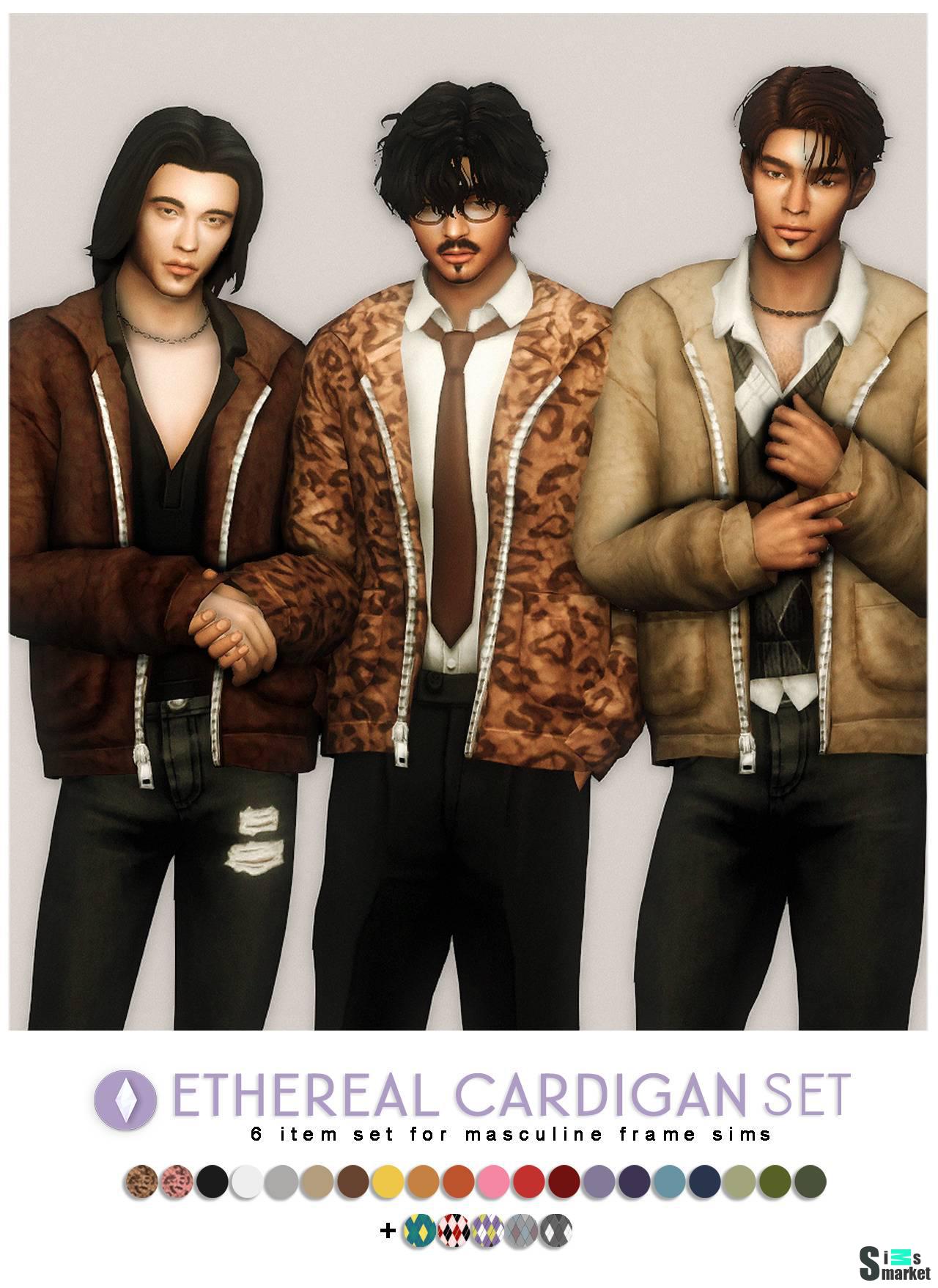 Более качественный отредактированный набор Ethereal Cardigan Set от nucrests (для корректного отображения новых файлов необходимо удалить старый набор, если он у вас есть). 3 предмета гардероба: - тёплый меховой кардиган на молнии (см. раздел Верхняя часть одежды, 20 ц.в.) + топ с V-образным вырезом (см. раздел Браслеты, 18 ц.в.) - кардиган + рубашка с V-образным вырезом (см. раздел Верхняя часть одежды, 20 ц.в.) и свитер (см. раздел Браслеты, 23 ц.в.) - кардиган + заправленная рубашка (см. раздел Верхняя часть одежды, 20 ц.в.) и галстук (см. раздел Браслеты, 23 ц.в.) Maxis Match. Доступно для мужчин. Проверено на лицензионной версии: 1.93.146.1020