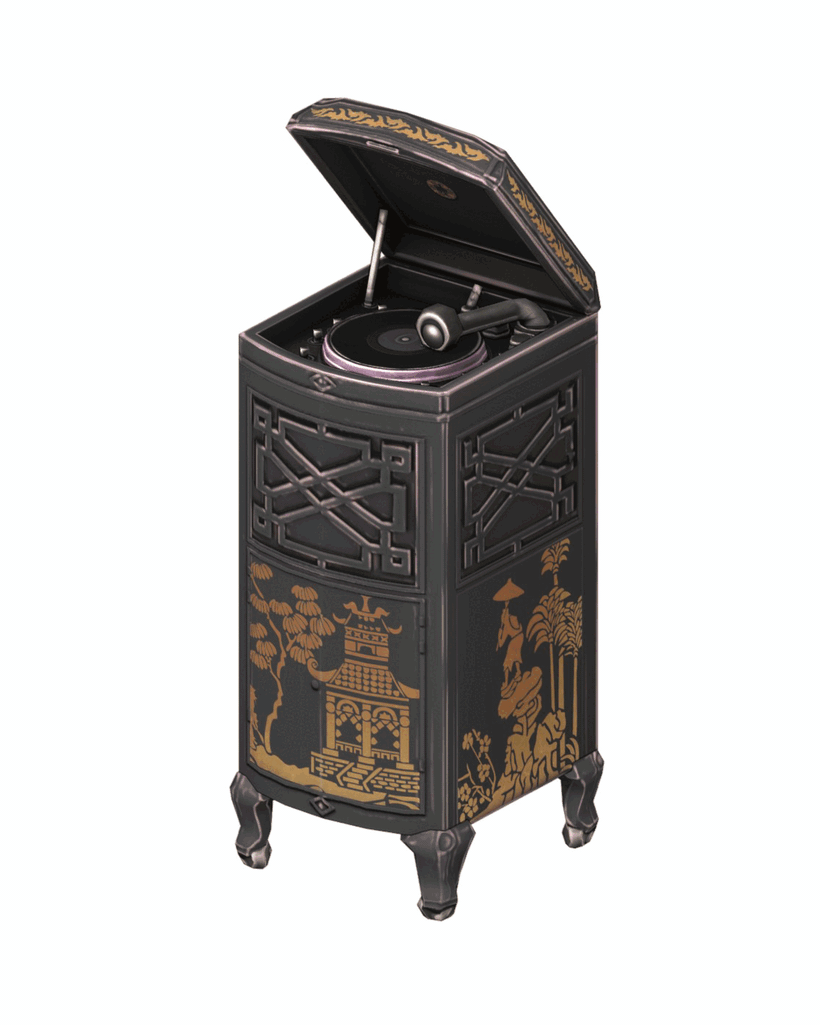 Патефонный шкаф Canton — эффектный акцент для дома в стиле шинуазри. Он имеет полированный чёрный корпус из вокса, украшенный изысканной росписью в стиле шинуазри по бокам и на крышке. Это не просто музыкальный проигрыватель, это прекрасный декоративный предмет и исторический артефакт, идеально подходящий для улучшения настроения ваших персонажей! 🎼 🪗