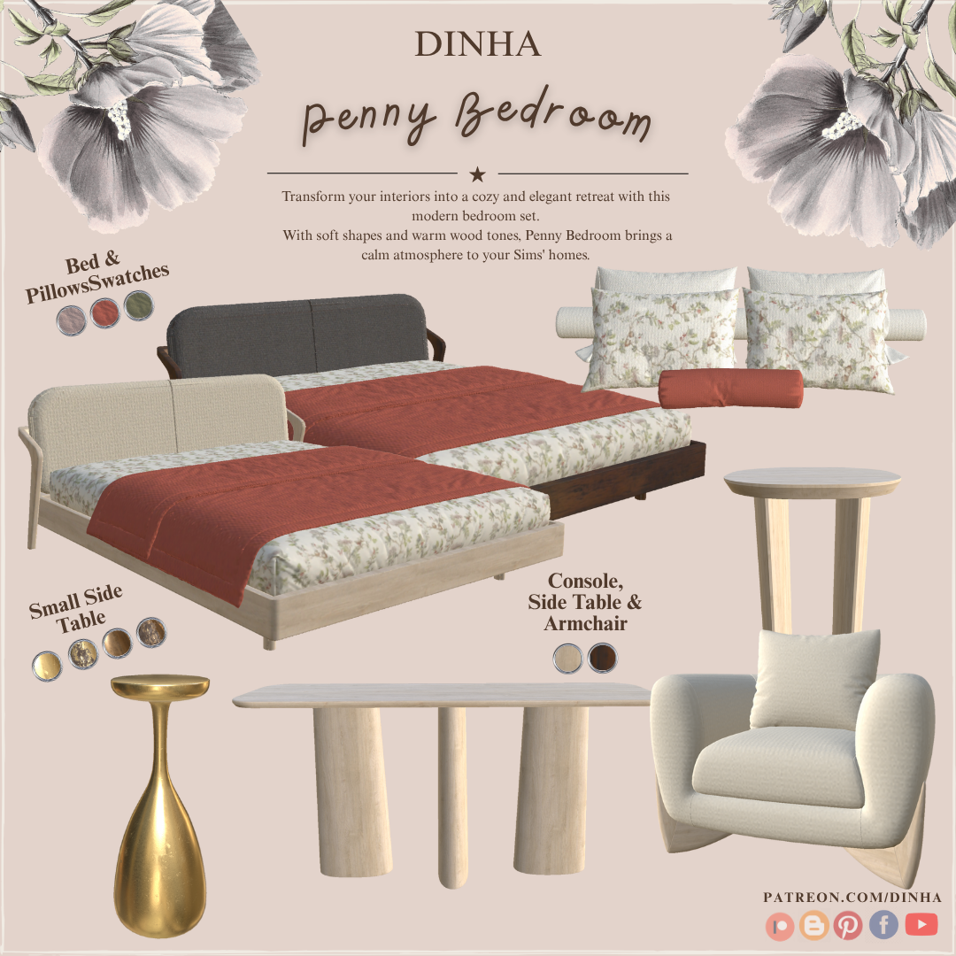 Превратите свой интерьер в уютное и элегантное место отдыха с этим современным комплектом мебели для спальни Penny. Благодаря плавным линиям и тёплым оттенкам дерева, спальня Penny создаст атмосферу спокойствия в домах ваших персонажей. В комплект входят две кровати, консоль, кресло, прикроватный столик в двух вариантах и полный комплект подушек — всё это создано для сочетания комфорта и изысканности.