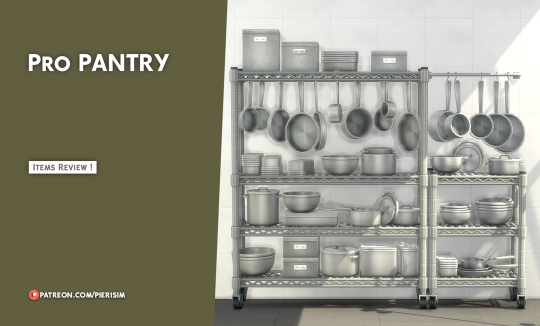 PRO PANTRY посвящен кухонному инвентарю, но ориентирован на большинство профессионального оборудования, поэтому его можно использовать как в ресторанах, так и дома! Пришло время навести порядок в профессиональных кладовых! С этим набором у вас будет много разнообразных кухонных принадлежностей, так что вы сможете создать очень оживленную кладовую — ведь именно это нам и нравится! Подвесные сковородки и кастрюли идеально закрепятся на полках, а для более традиционной кухни я также добавила варианты для настенного крепления. И, конечно же, эти полки очень универсальны, поэтому вы можете использовать их где угодно! Надеюсь, вам понравится экспериментировать с этими новыми профессиональными предметами! Вы можете найти эти предметы, выполнив поиск в игре по запросам PRO PANTRY или Pierisim. Совместимо со всеми играми базовой версии.
