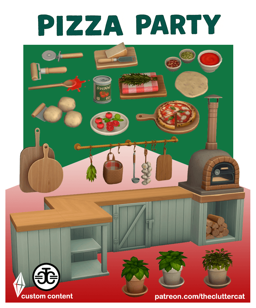 Game Version: 1.117 Увеличьте огонь и создайте идеальную площадку для приготовления пиццы с Pizza Party — детальной коллекцией пользовательского контента, в которую входят 23 новых объекта и все, что нужно вашим симам для создания восхитительной тематической постройки. Сердце коллекции — печь для пиццы в деревенском стиле, вдохновлённая традиционными итальянскими кухнями на открытом воздухе. Если у вас есть каталог «The Sims™ 4 Домашний повар: Суета» , печь полностью функциональна и готова к выпечке. Для тех, у кого нет этого набора, предусмотрена декоративная версия, чтобы вы могли наслаждаться аутентичным внешним видом и атмосферой. Чтобы создать приятную атмосферу, в наборе есть множество милых и увлекательных мелочей. Здесь вы найдёте консервированные ингредиенты, необходимые для приготовления пиццы предметы, такие как резак, инструменты для теста, базилик и многое другое: все эти мелочи оживят вашу пиццерию. Завершает коллекцию подходящая уличная стойка, выполненная в том же тёплом деревенском стиле, который прекрасно объединяет всё. Независимо от того, планируете ли вы обустроить романтическое итальянское бистро, место для отдыха семьи и друзей на заднем дворе или просто хотите добавить немного итальянского очарования в повседневную жизнь своих персонажей, Pizza Party привнесет в вашу игру теплоту, индивидуальность и частичку la dolce vita. В комплект входят: БазиликумРастение CanedDelicacies CanedDelicacies_3x Тестораскаточная машина Мелисса OliveWoodPizzaBoard OvenAccentCounter пармезан PizzaCutter PizzaDough PizzaIngredients PizzaKitchenUtilityRail PizzaOven PizzaOven_unactive PlainPizzaDough Композиция с розмарином RusticBoards RusticOutdoorAccentCounter (2 варианта) RusticOutdoorCounter Тимьян TomatoPlate Деревянная ложка для готовки